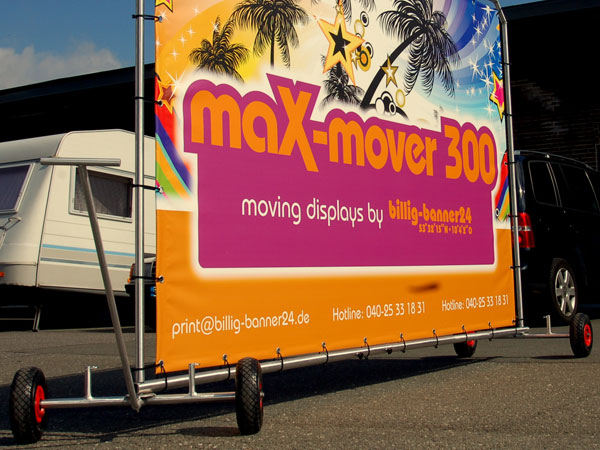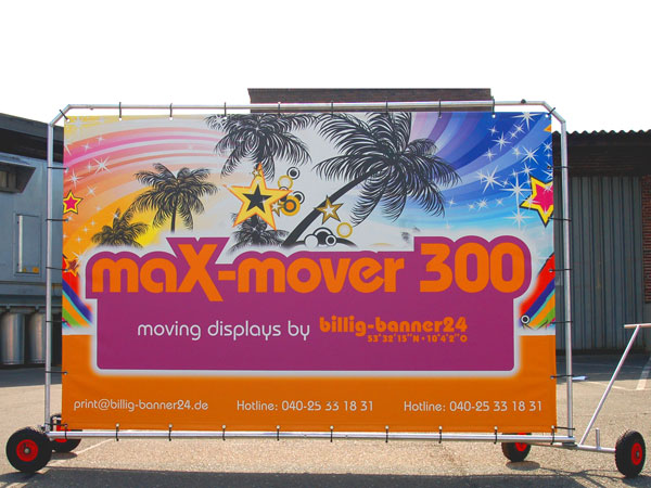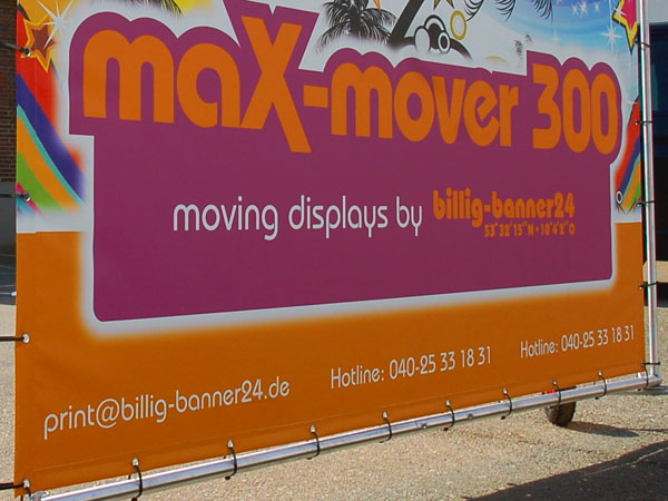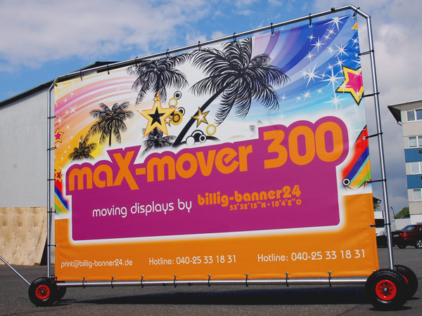 Knud Hagedorn, billig-banner24: „Mit der Entwicklung des maX-mover 300 zielt billig-banner24 genau auf diese Interaktion ab. Mit dem maX-mover 300 bieten wir ein innovatives Instrument der Kommunikationspolitik während zeitlich begrenzter Aktionen oder auch zur zeitlich unbegrenzten Standortpromotion. Mit dem maX-mover 300 bietet sich die Möglichkeit ihre CI, oder Informationen zum Unternehmen oder Produkten kostengünstig und direkt vor der relevanten Zielgruppe zu transportieren.“