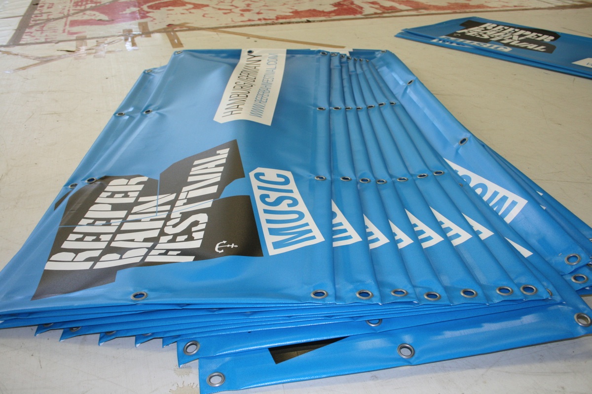 Knud Hagedorn, billig-banner24: „Wir sind gut aufgestellt, die Produktion läuft auf Hochtouren. Die Werbebanner und Werbeplanen für das Reeperbahnfestival sind fast fertig. Wir werden unsere Liefertermine halten und freuen uns wahnsinnig, die Vielzahl von Werbeplanen auf dem Festival sehen zu können.“
