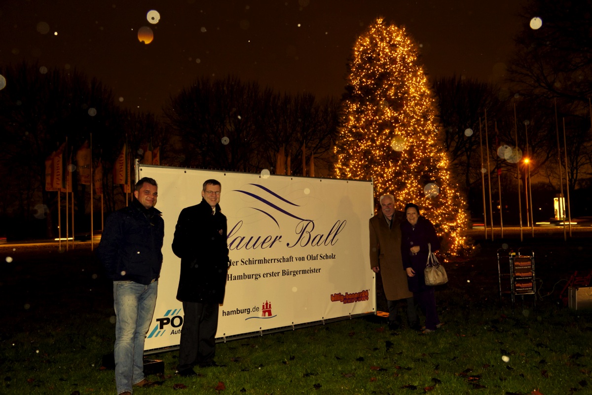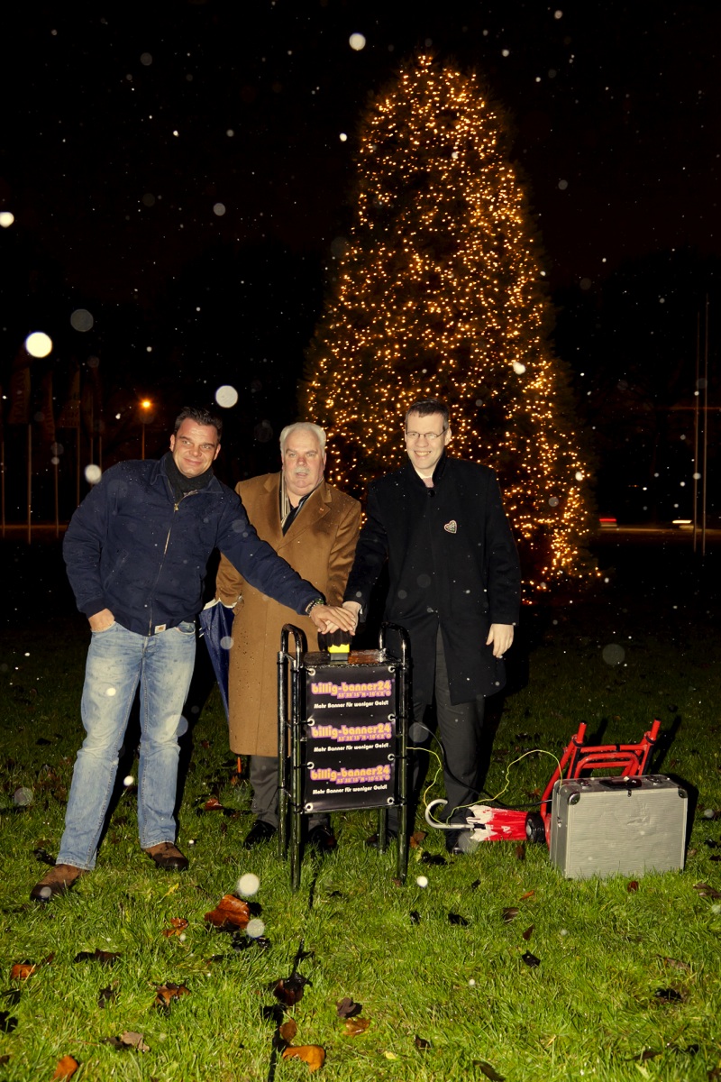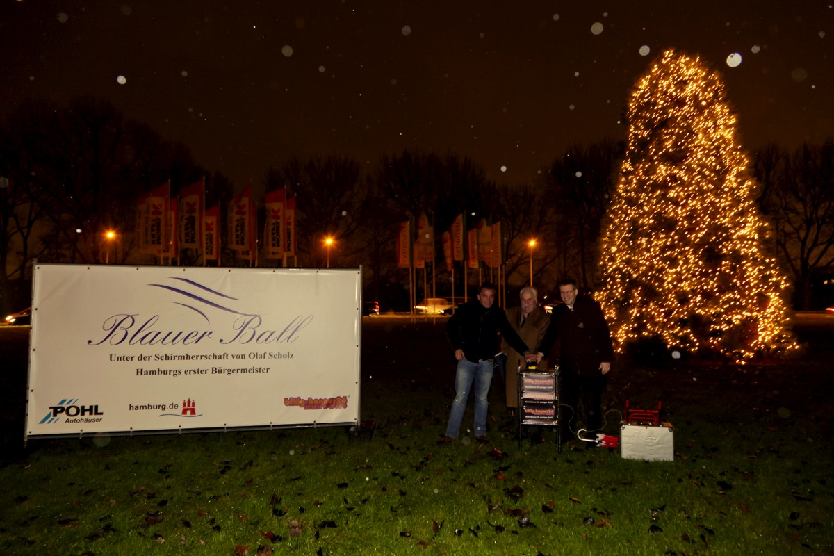Am Montag den 5.12.2011 um 17.00 Uhr war es soweit, erstmalig seit über 30 Jahren leuchtet der Tannenbaum auf dem Horner Kreisel festlich. Bezirksamtsleiter Markus Schreiber, Knud Hagedorn, Geschäftsführer billig-banner24® und Günter Ehnert vom Blauen Ball drückten gemeinsam auf den Startknopf.