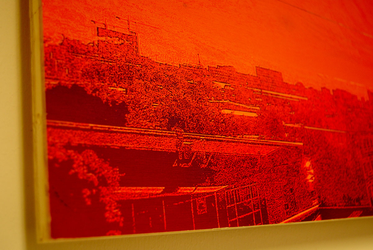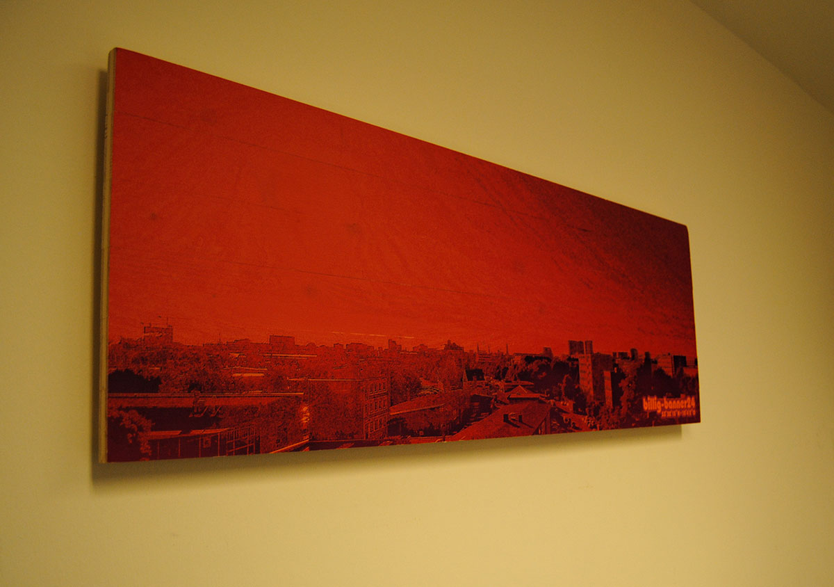 Der Druck besteht aus mehreren Holz-Latten. Diese Latten werden auf der Rückseite mit zwei Querstreben zusammengehalten. Zum Aufhängen dient ein in das Holz eingelassener, gezahnter Halbkreis. Das Anbringen an die Wand ist daher denkbar einfach. Diese Drucke sind natürlich ausschließlich für den Innenbereich gedacht. Holz arbeitet, da es ein Naturstoff ist. Es ist lebendig. Um lange daran Freude zu haben, empfiehlt es sich, einen Raum mit konstanter Luftfeuchtigkeit und nicht allzu großen Temperaturschwankungen zu wählen.