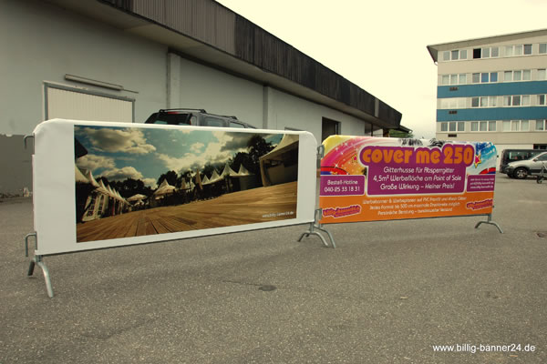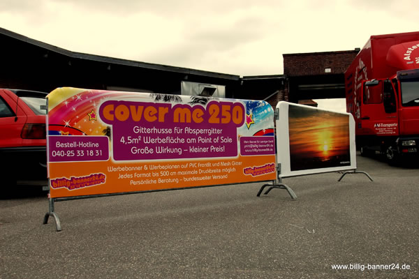 Die hier angebotene Werbehusse cover me 250 ist für standardisierte Absperrgitter 250 cm x 90 cm konzipiert, die in der Regel genormt ist. Andere Werbehussen für abweichende Formate können selbstverständlich auch angefertigt werden.